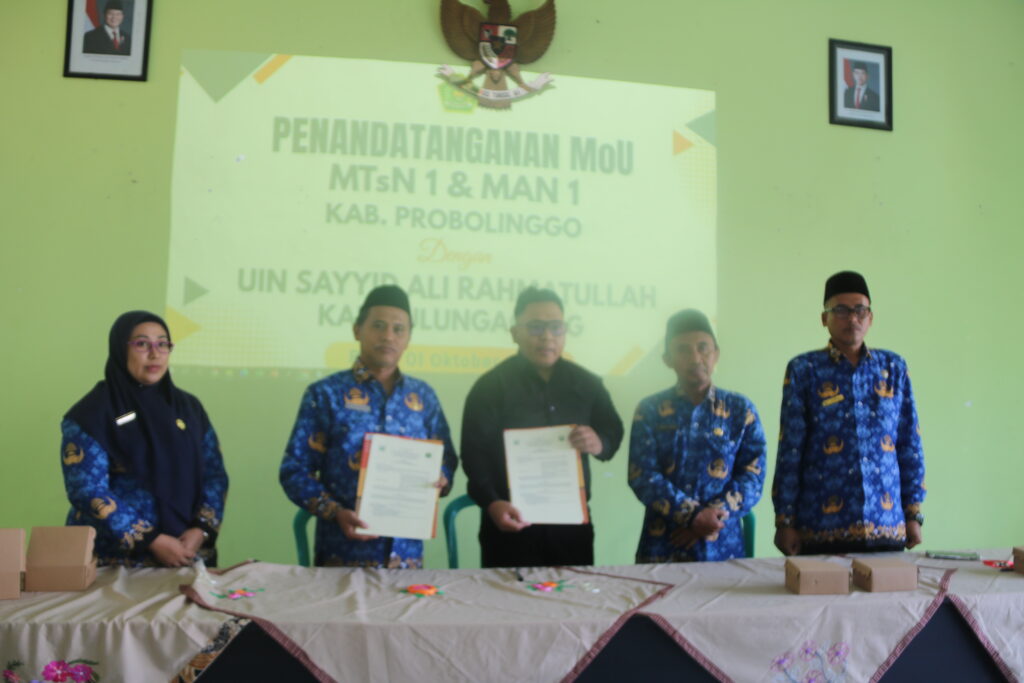 Humas Matsapro–Rabu, (1/10/2025) Dalam rangka meningkatkan kualitas pendidikan serta membangun sinergi antar-lembaga, MTsN 1 Probolinggo dan MAN 1 Probolinggo resmi menandatangani Nota Kesepahaman (MoU) dengan Universitas Islam Negeri (UIN) Sayyid Ali Rahmatullah Tulungagung. Penandatanganan berlangsung khidmat di Aula MTsN 1 Probolinggo, dan dihadiri oleh pimpinan dari ketiga lembaga.