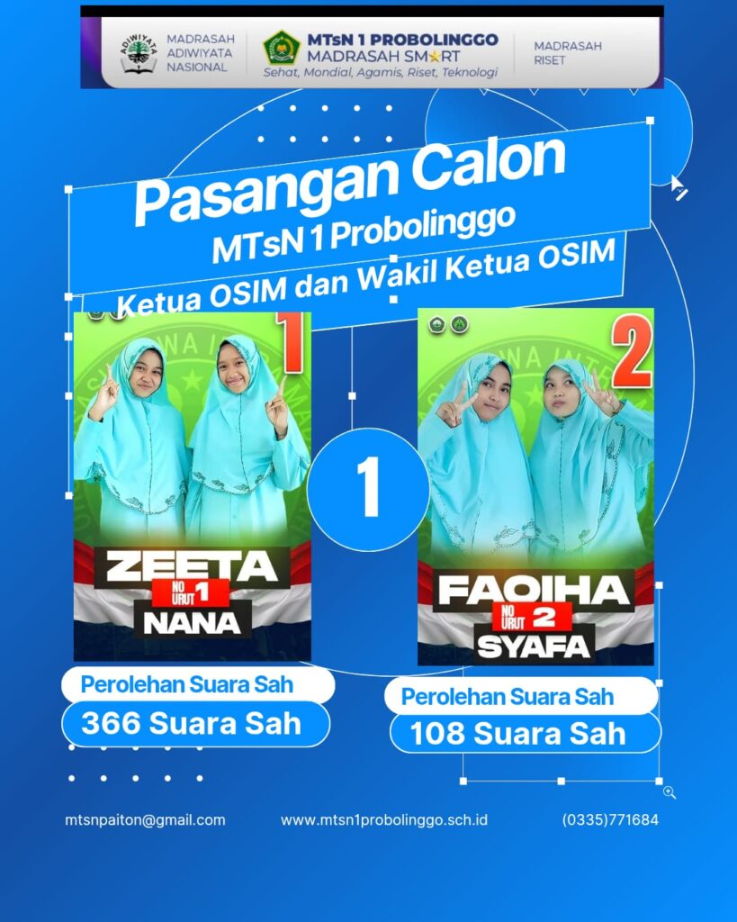 Humas Matsapro-MTs Negeri 1 Probolinggo sukses menggelar kegiatan pemilihan ketua dan wakil ketua Organisasi Siswa Intra Madrasah (OSIM) periode 2025/2026 di halaman madrasah pada Senin, (27/10/2025). Kegiatan ini berlangsung meriah dan tertib, dengan antusiasme tinggi dari seluruh warga madrasah.